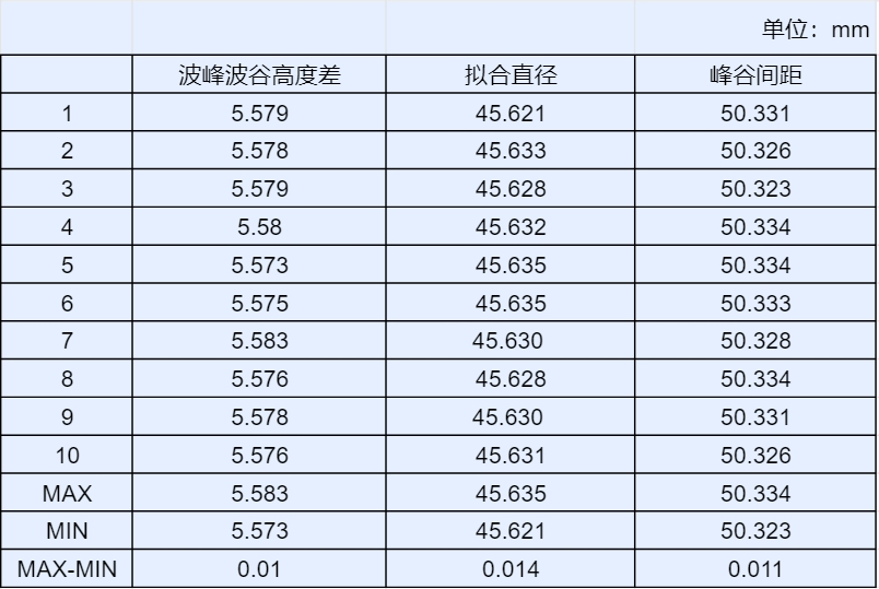 Measurement Results: After 10 dynamic measurements, the repeatability of the fitted diameter of the water-cooled plate is 0.014 mm, and the full-wave pitch is 0.011 mm, meeting the measurement requirements of ±0.03 mm for full-wave diameter and ±0.03 mm for full-wave pitch.