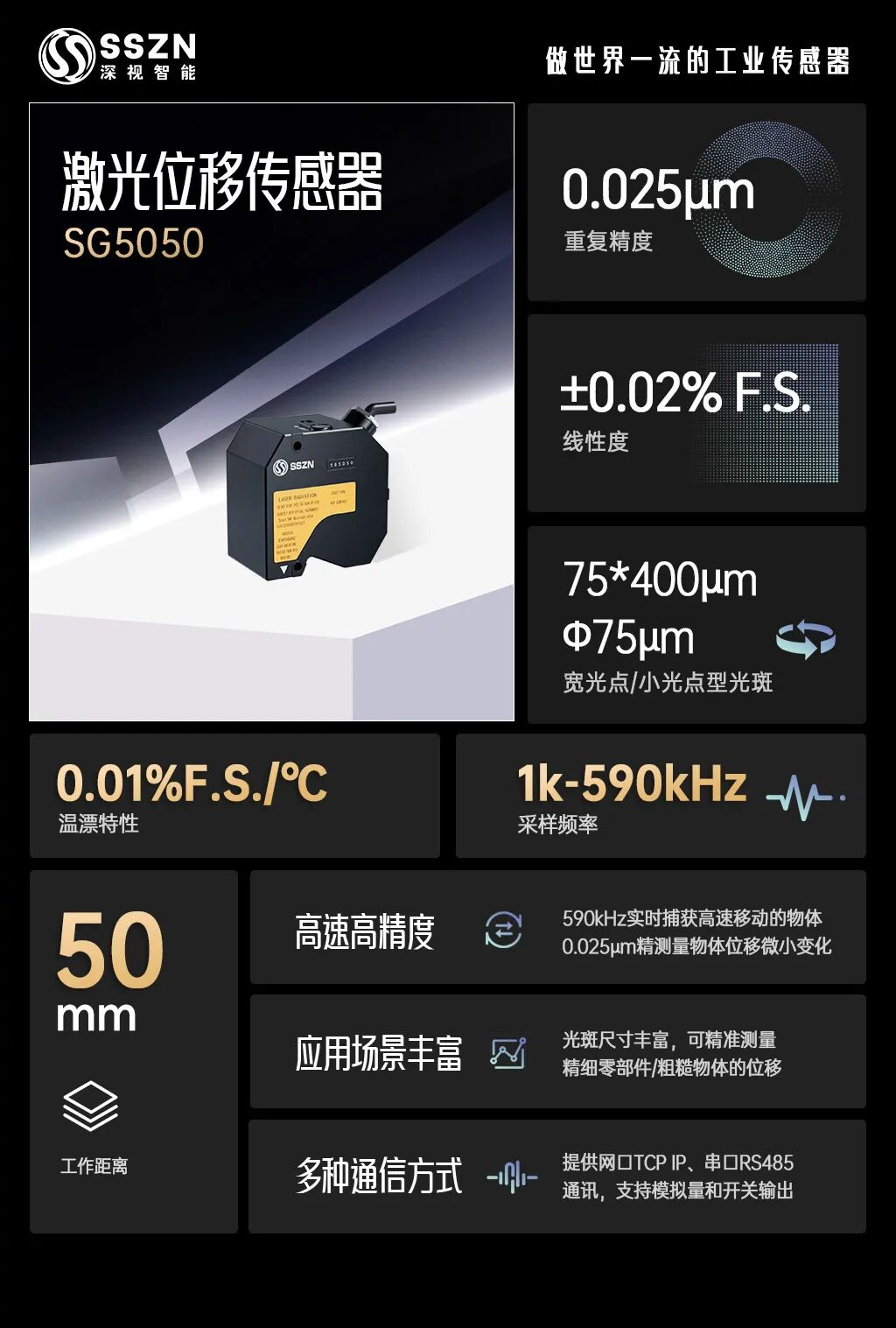 Based on the laser triangulation measurement principle, the Shenshi Intelligent SG5050 Laser Displacement Sensor establishes a high-precision measurement system. It can acquire high-density data points with small spacing at a sampling frequency of up to 590 kHz and a repeatability accuracy of 0.025 μm.