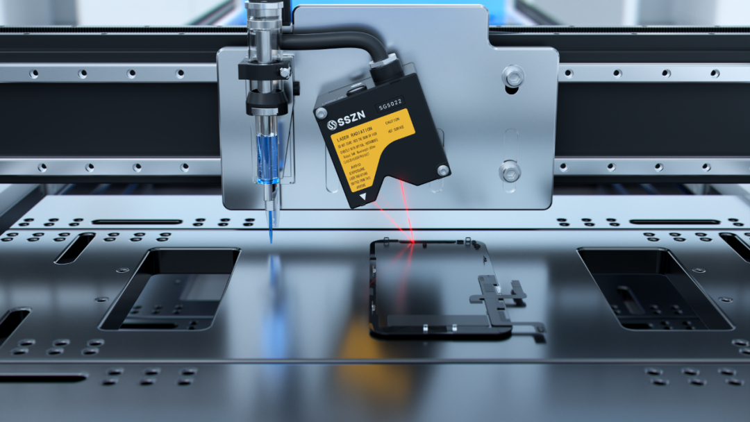 Achieve high precision in smartphone screen blind hole dispensing. SinceVision SG5025 laser displacement sensors provide stable measurement on reflective glass surfaces.
