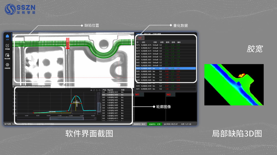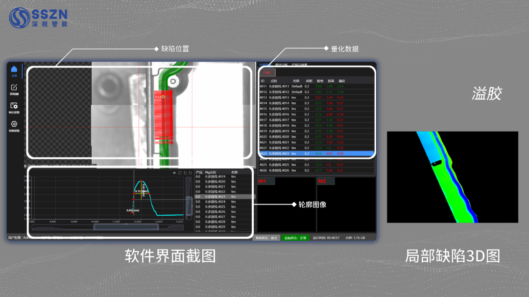 On the main interface, the system accurately associates and synchronously displays defect locations, precise quantitative data (such as glue height and width), and 2D/3D profile images. Using color-mapped heatmaps, the distribution and severity of various defects — including broken glue, overflow, and narrow glue — are clearly visible. On-site personnel can quickly complete defect positioning, qualitative analysis, and severity assessment without repeated comparison across multiple images.